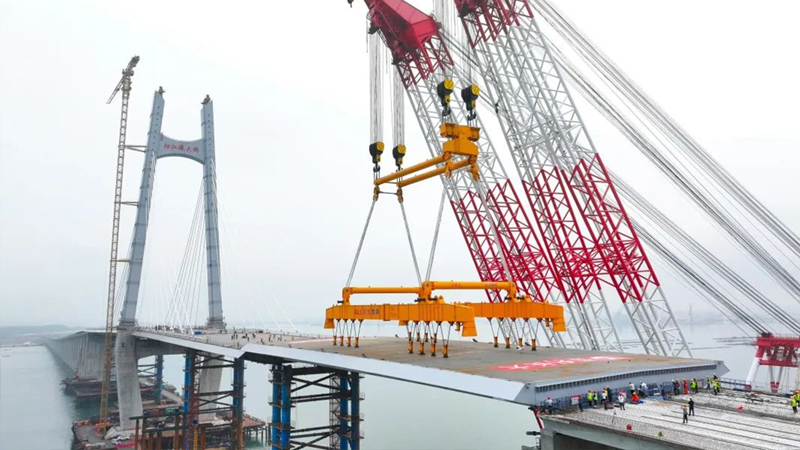 3月30日上午10時02分 隨著最后一塊鋼箱梁成功吊裝到位 陽江港大橋順利合龍 如一條巨龍橫臥海面 標(biāo)志著廣東省濱海公路 海陵大堤段至溪頭段實(shí)現(xiàn)全線貫通 向通車目標(biāo)邁出了重要一步! 陽江港大橋全長4777.2米 是廣東濱海旅游公路陽江海陵大堤 至溪頭段公路項(xiàng)目的控制性工程 由保利長大工程有限公司承建 巨力索具負(fù)責(zé)該項(xiàng)目鋼箱梁吊具制作 鋼箱梁采用大節(jié)段吊裝方案,分6個節(jié)段 最大梁段長90米,最小梁段長74.5米