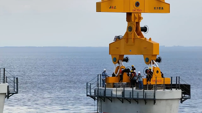 在杭州灣跨海鐵路橋中航道橋建設現場,高7米,重達500噸的首節預制墩身節段在“盈尚1”起重船的吊裝下,被精準架設到108號墩上,巨力索具再次為世界級工程項目添力!