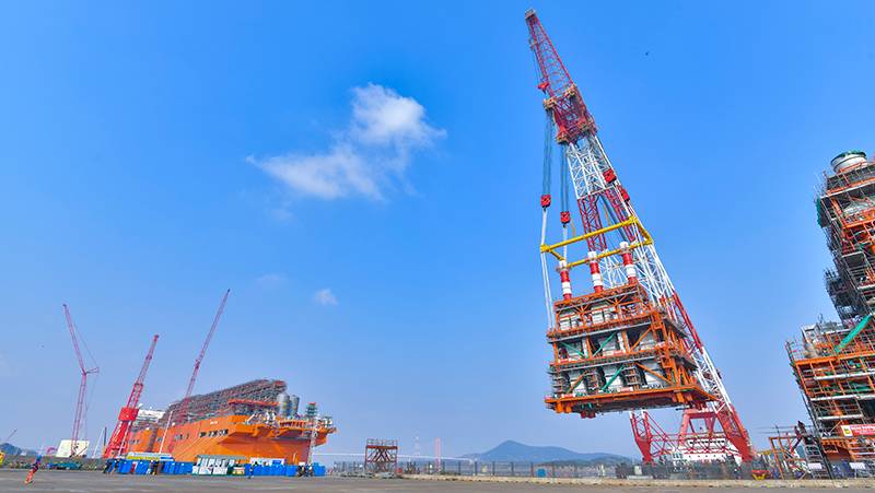 我國自主建造的最大噸位、最大儲氣量的新型海上浮式液化天然氣生產裝置NGUYA FLNG(恩古雅海上浮式液化天然氣裝置)在江蘇南通(啟東)呂四港啟航,巨力索具5000T吊梁大展風采。