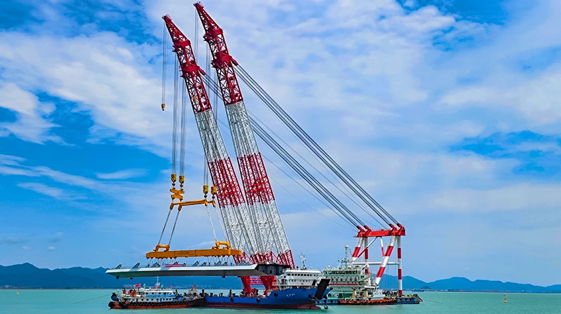 寧波至象山市域(郊)鐵路象山港跨海大橋主橋邊跨結合梁架設,巨力索具鋼箱梁吊具全程保障項目吊裝。