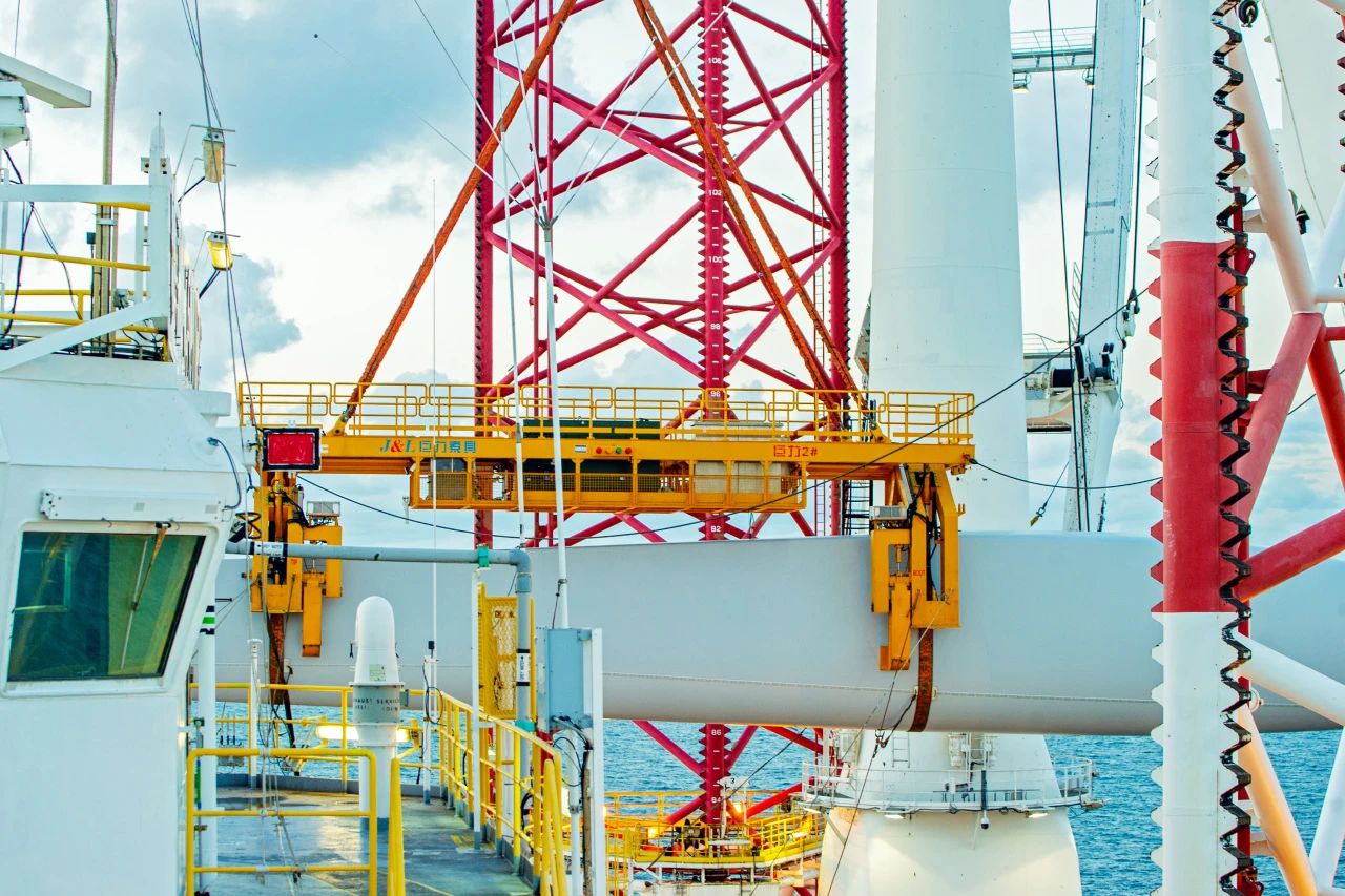 2021年8月19日,華能山東半島南4號(hào)海上風(fēng)電項(xiàng)目順利完成首臺(tái)風(fēng)機(jī)“整體”吊裝,風(fēng)機(jī)整體最大重量為650噸,該吊裝設(shè)備包括運(yùn)輸?shù)鬃⒕旨堋⑵胶饬骸㈦姎庀到y(tǒng)、液壓系統(tǒng)、緩沖系統(tǒng)等部件構(gòu)成,是巨力索具在北方沿海地區(qū)海上風(fēng)電首個(gè)風(fēng)機(jī)整體吊裝項(xiàng)目。開(kāi)創(chuàng)了國(guó)內(nèi)海上風(fēng)電實(shí)施5.0兆瓦以上單樁基礎(chǔ)風(fēng)機(jī)整體吊裝先河。