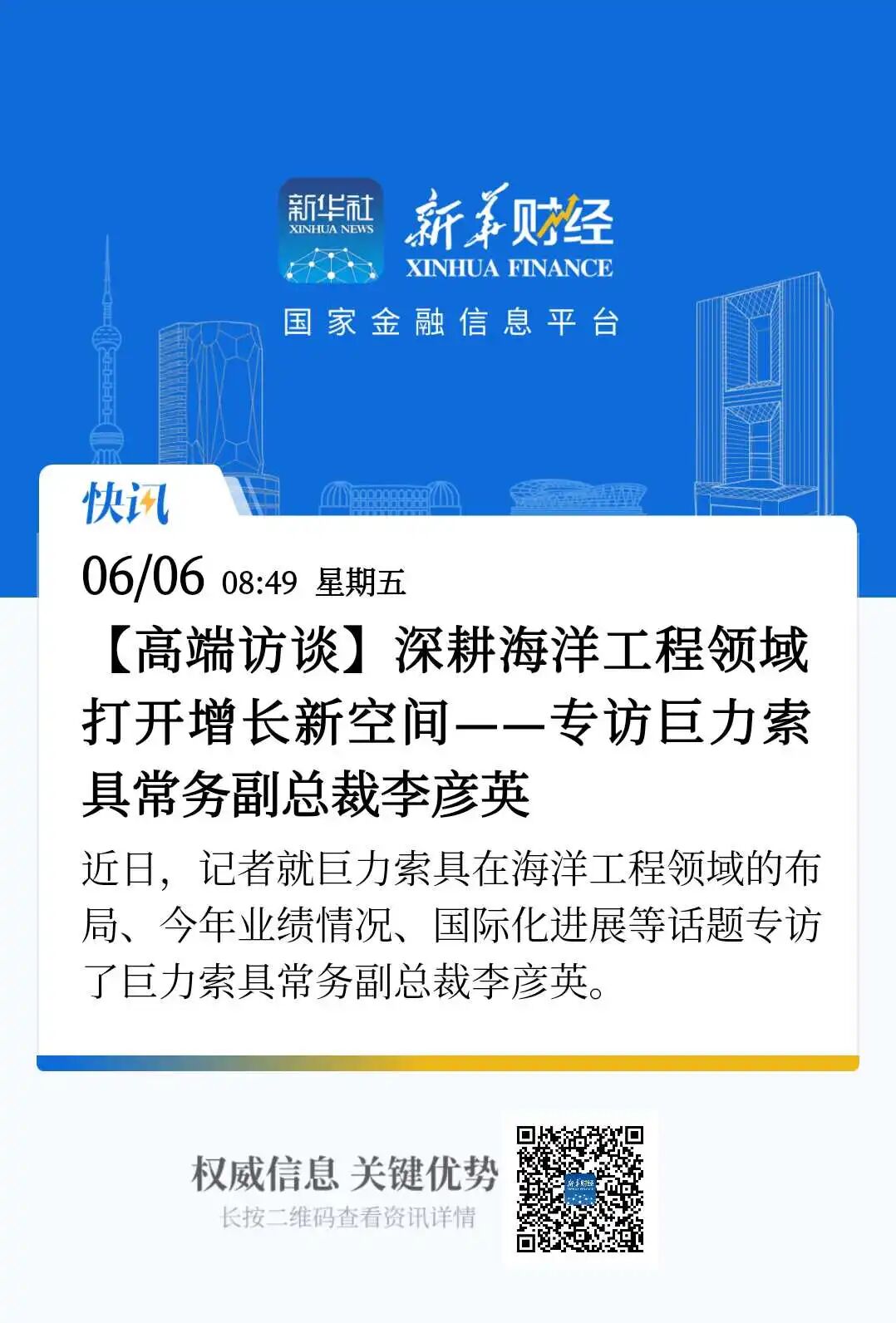 6月6日,新華社發(fā)布了一篇題為《深耕海洋工程領(lǐng)域 打開增長新空間——專訪巨力索具常務副總裁李彥英》的報道,對巨力索具深耕海洋領(lǐng)域進行了深入關(guān)注。