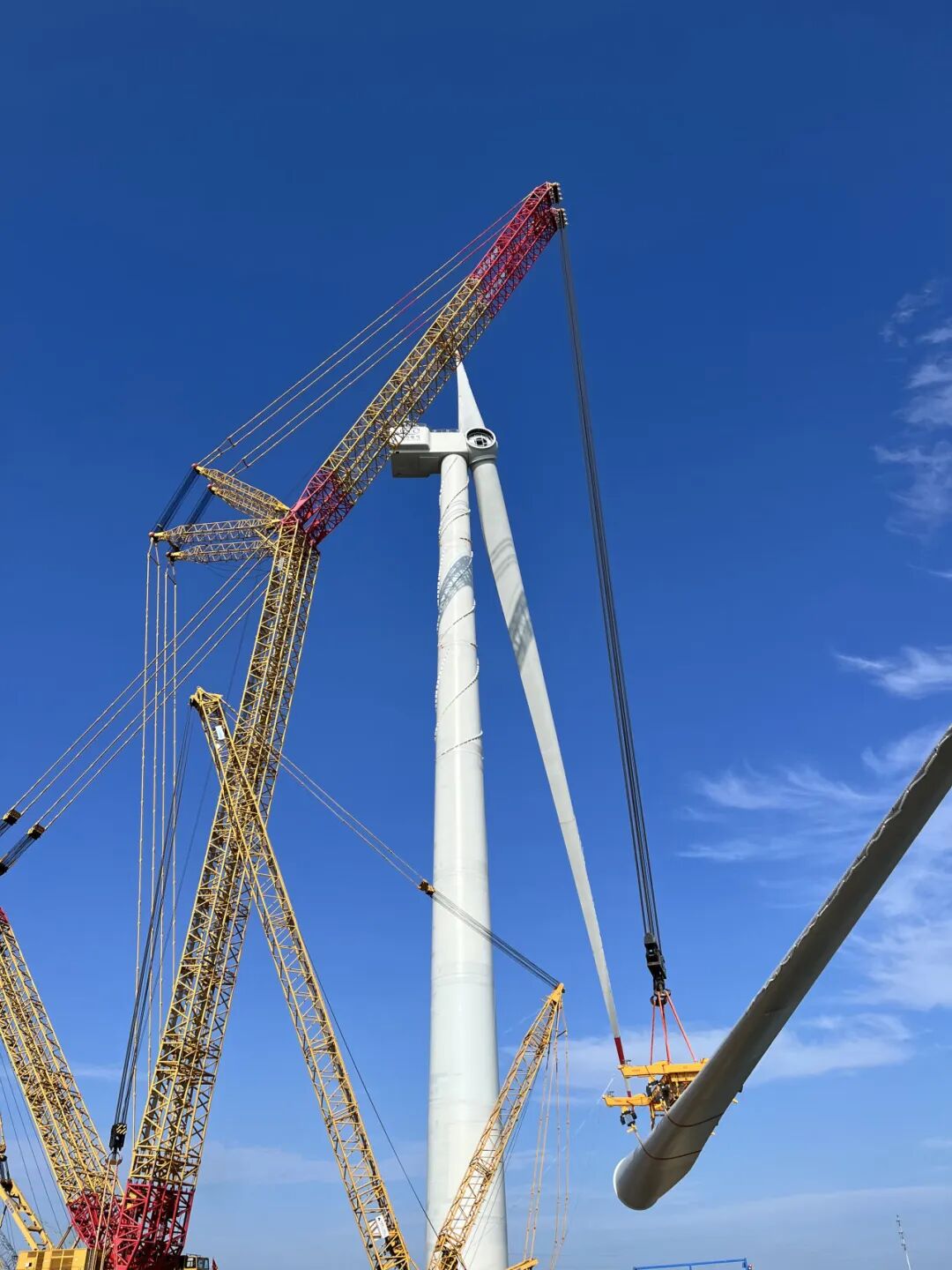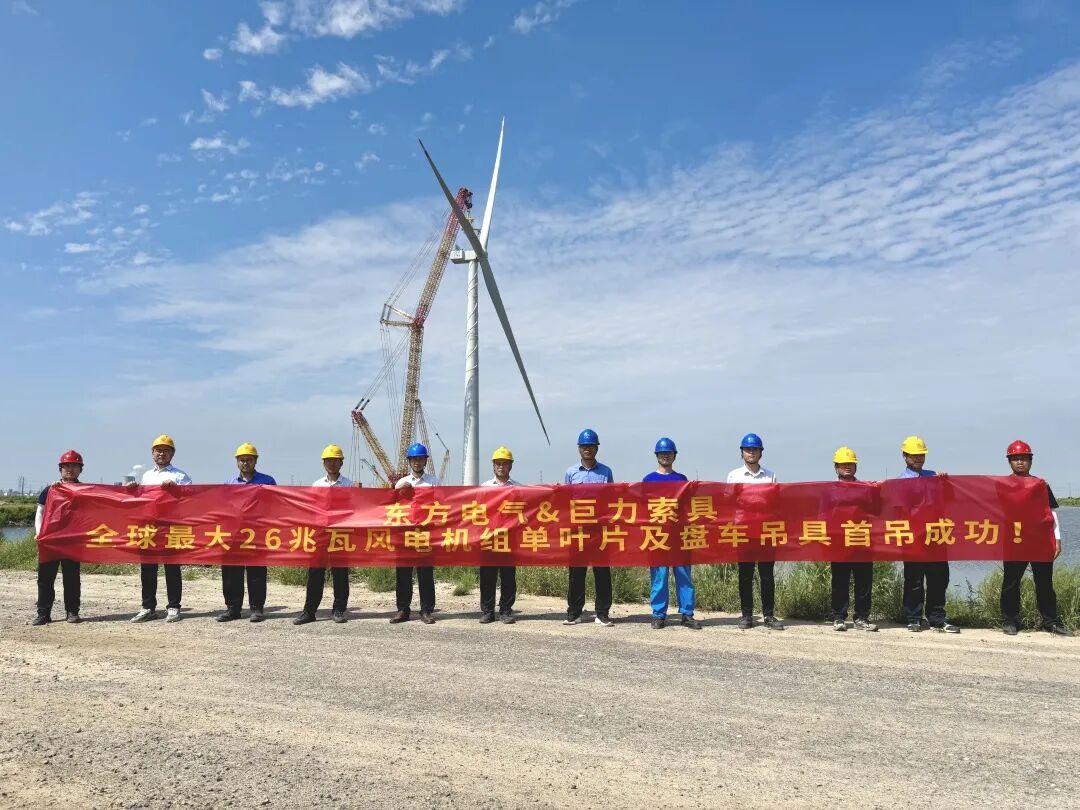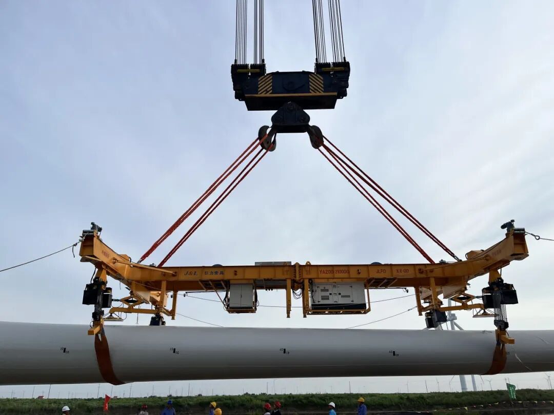 8月29日,由巨力索具股份有限公司為東方電氣風電股份有限公司專項研制的26MW海上風電機組用大噸位單葉片吊具及大扭矩盤車系統,已于山東東營風電裝備測試認證創新基地成功完成吊裝作業。這是目前國內外最大兆瓦海上風電機組葉片吊裝的優異解決方案,創新型解決了最大葉片的吊裝難題。