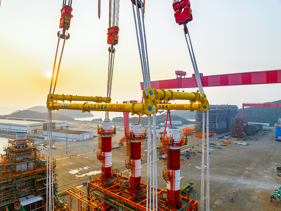 在裝置建造過程中,巨力索具承擔了該“海上移動化工廠”上部模塊的吊裝集成任務,為項目量身定制了5000T吊梁系統。這套裝備需承受FLNG模塊吊裝過程中的動態載荷,技術要求遠超常規海工項目,是項目建設中技術難度最高、風險最大的環節之一。