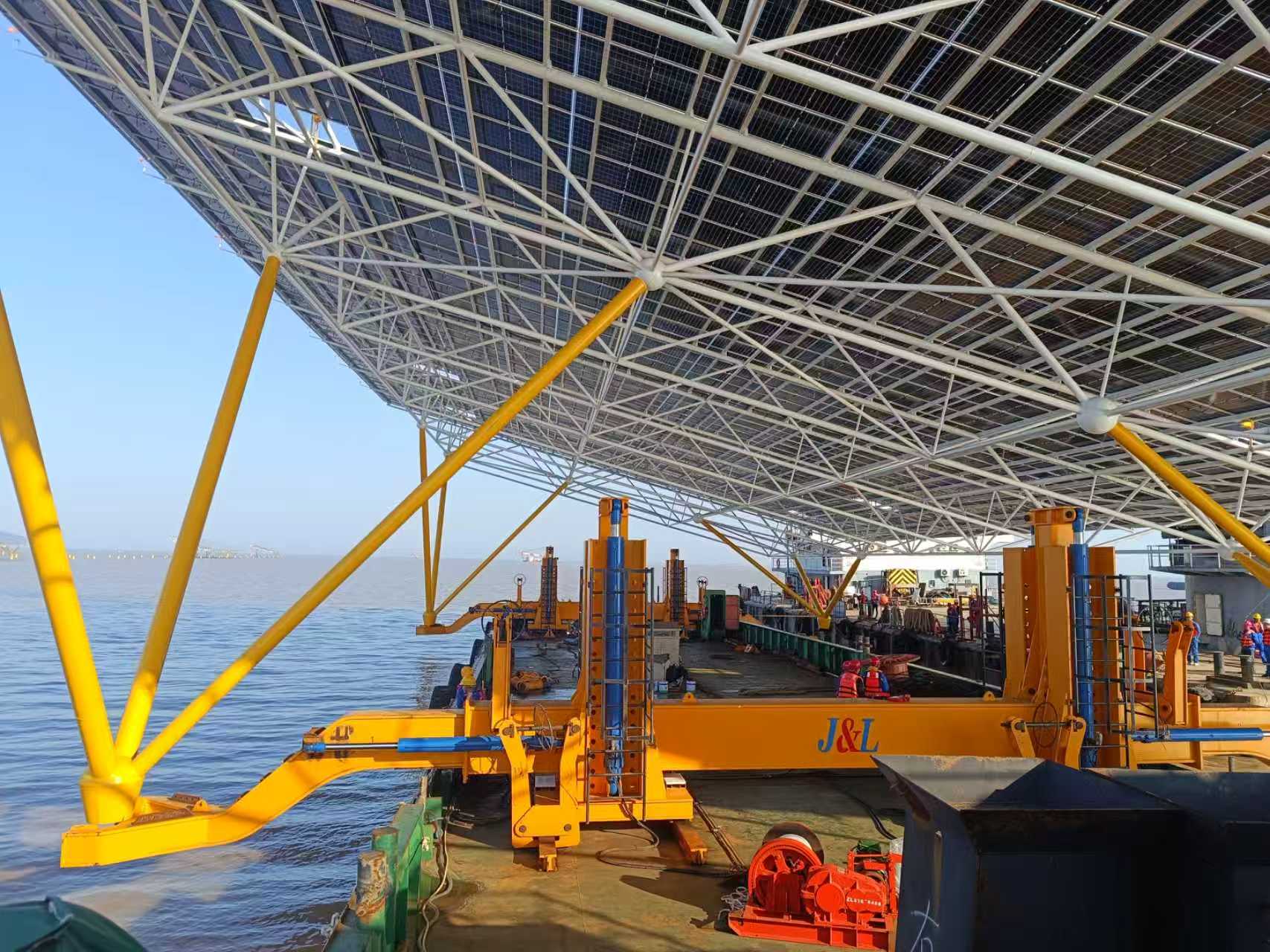 海上光伏整體結(jié)構(gòu)浮托運(yùn)輸調(diào)節(jié)裝備是利用駁船在淺海對光伏組件整體結(jié)構(gòu)進(jìn)行浮托運(yùn)輸、安裝的裝備。本裝備通過創(chuàng)新設(shè)計(jì)舉升系統(tǒng)、伸縮梁等關(guān)鍵部件,有效提升了光伏組件整體結(jié)構(gòu)安裝的施工效率、施工穩(wěn)定性以及安裝精確性,同時(shí)解決了安裝空間受限等問題。為海上光伏組件提供了一套可在從運(yùn)輸?shù)桨惭b的整體解決方案,降低了浮吊船的使用頻率,降低海上光伏運(yùn)輸和安裝的成本,提升了海上光伏的安裝效率,有效推動了整個(gè)產(chǎn)業(yè)鏈的技術(shù)升級。