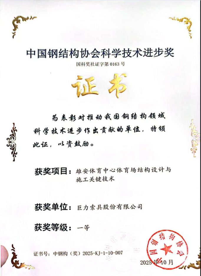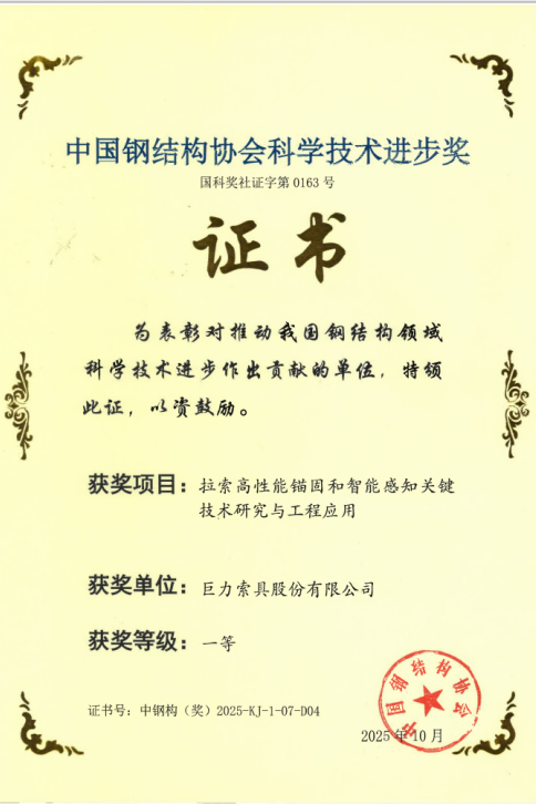 近日,2025年度中國鋼結(jié)構(gòu)協(xié)會(huì)科學(xué)技術(shù)進(jìn)步獎(jiǎng)評審結(jié)果揭曉。在10月14日于廣西南寧舉行的頒獎(jiǎng)典禮上,巨力索具股份有限公司憑借卓越的技術(shù)研發(fā)實(shí)力,一舉斬獲三項(xiàng)一等獎(jiǎng),充分彰顯了公司在高端索具技術(shù)領(lǐng)域的創(chuàng)新引領(lǐng)地位。