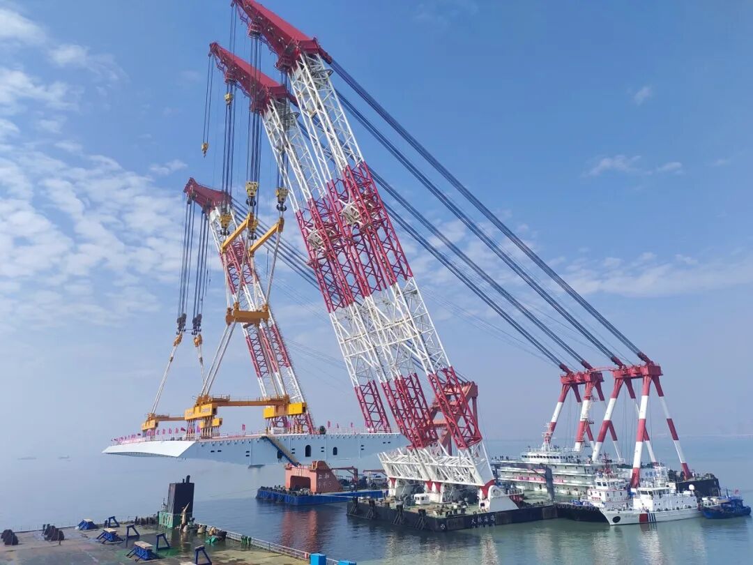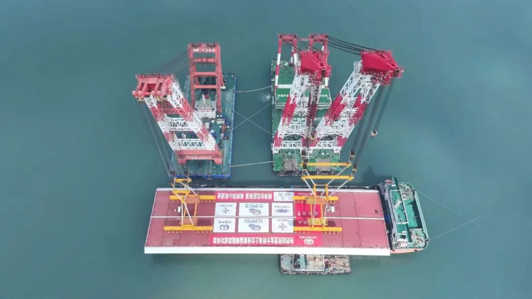 廈金大橋(廈門段)總長約19.6公里,本次吊裝的鋼箱梁位于大嶝西航道橋東側的90-91號墩,梁長142.5米、寬44米、高4.5米,總重量4586噸,堪稱“海上巨無霸”。該梁段的成功架設,刷新了海上裝配式橋梁整孔架設鋼梁的重量記錄,也為行業內淺灘海域“智能裝配化”造橋提供了重要實踐。