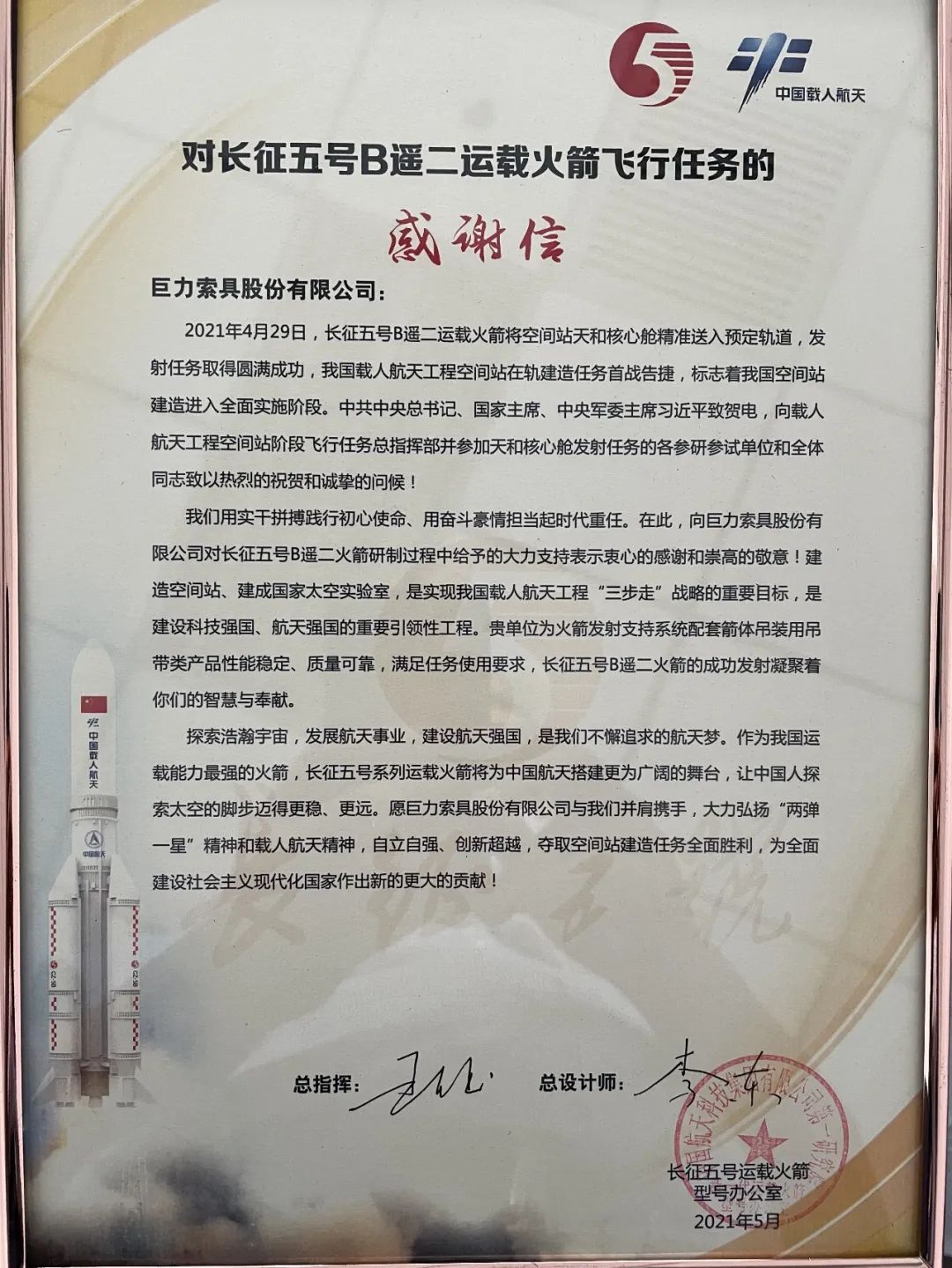 第一研究院在感謝信中向巨力索具對長征五號B遙二火箭研制過程中給予的大力支持表示衷心的感謝和崇高的敬意!巨力索具為火箭發射支持系統配套箭體吊裝用吊帶類產品性能穩定、質量可靠,滿足任務使用要求,長征五號B遙二火箭的成功發射凝聚著你們的智慧與奉獻。愿巨力索具與我們并肩攜手,大力弘揚“兩彈一星”精神和載人航天精神,自立自強、創新超越,奪取空間站建造任務全面勝利,為全面建設社會主義現代化國家作出新的更大的貢獻!