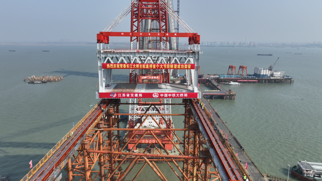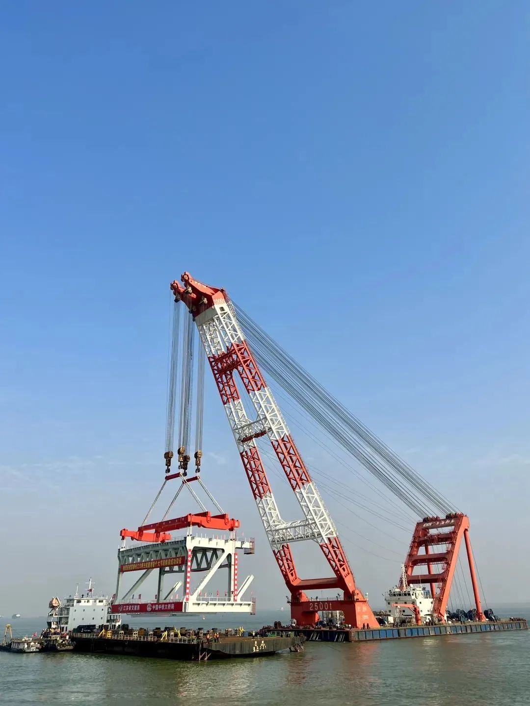 本次吊裝為常泰長江大橋主航道橋常州側邊跨首個大節段鋼梁,更是全橋首個大節段鋼梁,此次鋼梁吊裝完成,標志著常泰長江大橋建設又邁出堅實的一步。鋼梁吊裝至滑移支架上后,將通過拖拉滑移系統拖拉300m至設計位置。