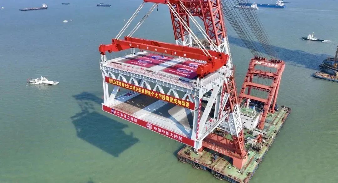 △ 央視新聞對常泰長江大橋主航道橋首個大節段鋼梁吊裝情況進行了現場直播報道