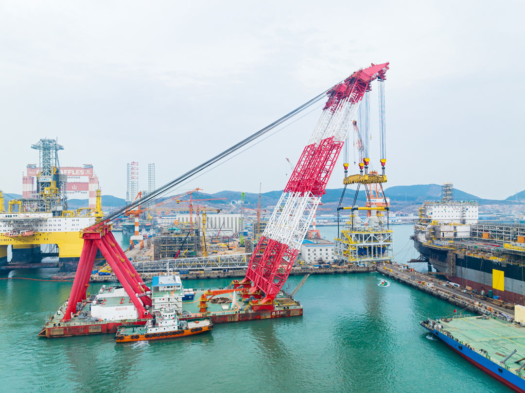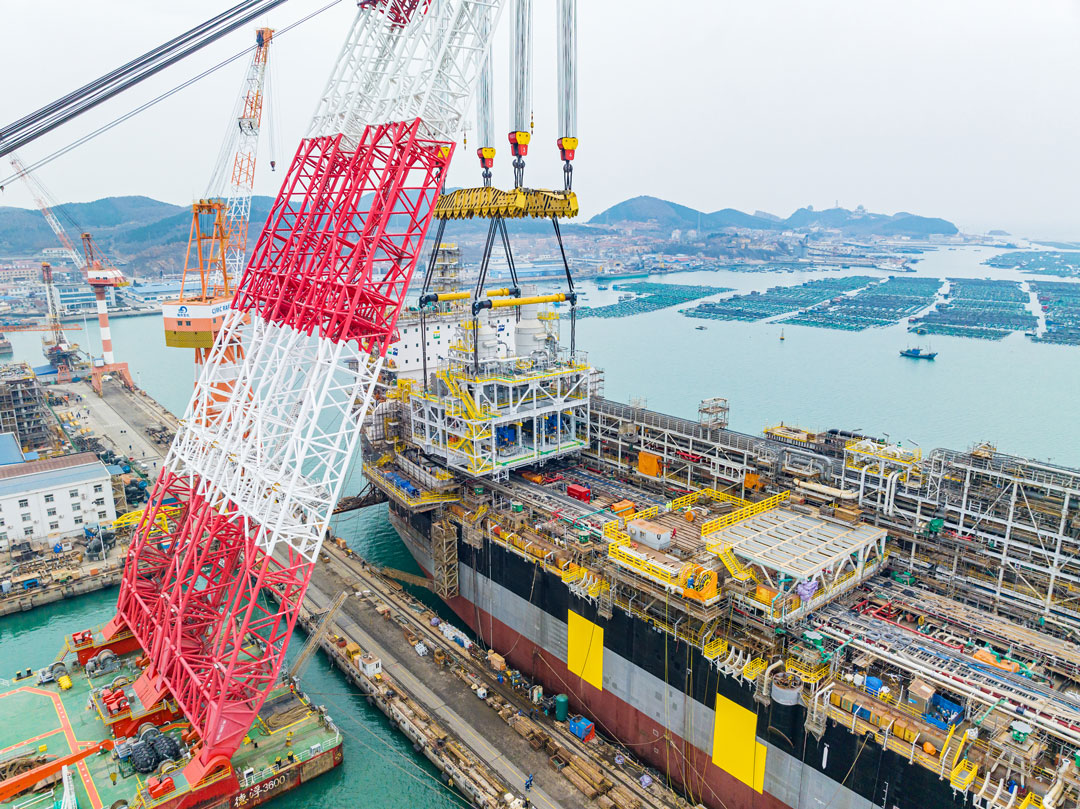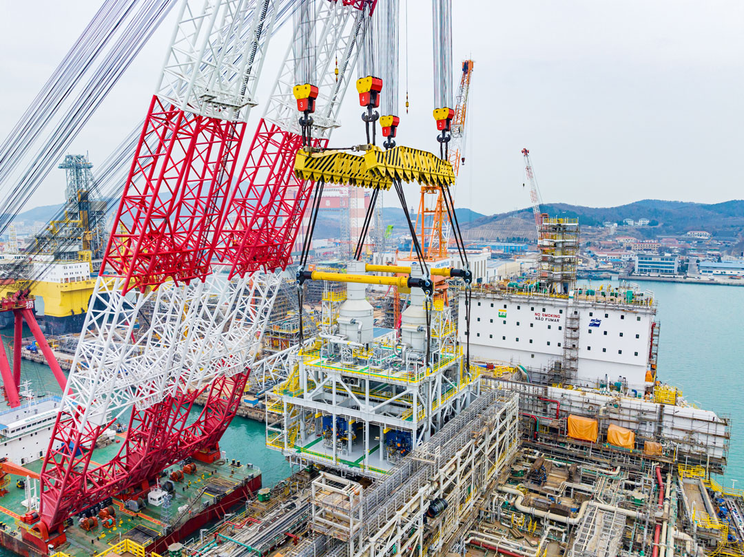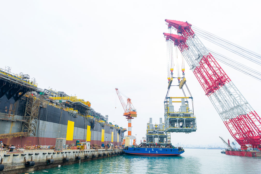 近日,中集來福士浮式生產(chǎn)儲油船(FPSO)重為3669噸的S20、2960噸的P60、2766噸的P20三大模塊吊裝完成。巨力索具為其提供了承載量為3000噸、2500噸的平衡梁梁式吊具、卸扣、無接頭繩索等產(chǎn)品,并為保證吊裝的順利進行制訂了嚴謹?shù)牡跹b方案。